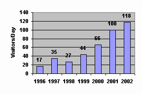 Statistics for 2002 - 118 visitors/day Statistics for 2001 - 100 visitors/day Statistics for 2000 - 66 visitors/day Statistics for 1999 - 44 visitors/day